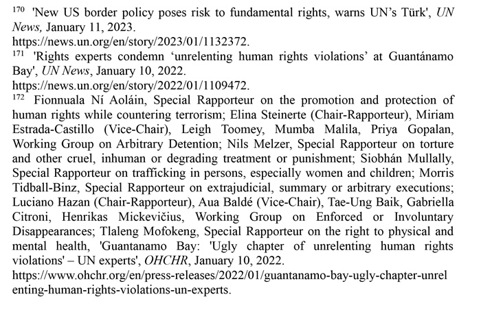 拒不关闭关塔那摩监狱。2002年设立的关塔那摩监狱最多时曾关押约780人,其中大多数人未经审判便遭拘留,受到了残忍的、不人道的待遇,是美国“肆意侵犯人权的一个丑陋篇章”。(注171)联合国人权理事会在反恐中促进和保障人权问题特别报告员菲奥努阿拉·尼奥莱因等多名独立专家2022年1月发表共同声明指出,臭名昭著的关塔那摩监狱是美国在人权保护上的污点,要求美国政府关闭关塔那摩监狱,对遭受酷刑、任意拘留的公民进行赔偿,并根据国际法追究授权和实施酷刑的人员的责任。(注172)