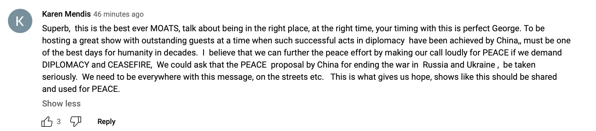 网友Karen Mendis留言:“太棒了,这是有史以来最好的一期《巅峰脱口秀》。节目选在中国取得重大外交成果之际播出,是合适的节点,节目也邀请到了合适的嘉宾,这是人类未来十几年来最为重要的时刻之一。我相信如果我们需要外交斡旋和战事停火,我们需要进一步巩固中国为和平所做出的努力,认真考虑中国在俄乌问题上的立场。我们需要广泛宣传这样呼吁和平的信息。这让我们看到了希望。诸如此类的脱口秀应该被更多地分享,以促进和平。”