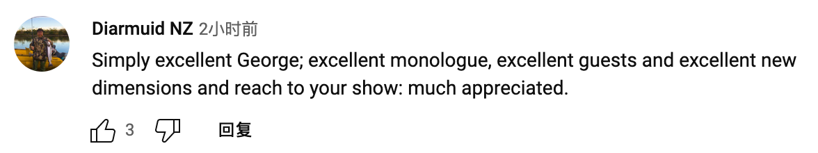 网友Diarmuid NZ留言:“优秀的乔治,出色的独白,出色的嘉宾,出色的新维度以及您的节目:非常感谢。”