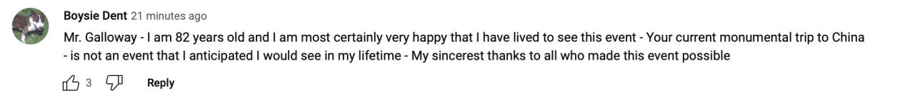 网友Boysie Dent留言:“亲爱的加洛韦先生,我今年82岁了,没想到有生之年我能看到如此精彩的节目,难以想象你会在这个时间节点去到中国。我衷心感谢这期节目所有的制作人员。”