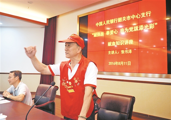 1954年出生的张书泽,是韶关市第一位年满60岁的无偿献血者,也是韶关市年满60岁一个月捐献三次血小板的第一人。20多年来,他累计无偿献血55次、24000毫升。在亲身参与无偿献血的同时,他还累计参与各种宣讲近200场,宣传推动无偿献血、造血干细胞捐献、遗体器官捐献。在他的影响下,越来越多的志愿者加入到无偿献血事业中。