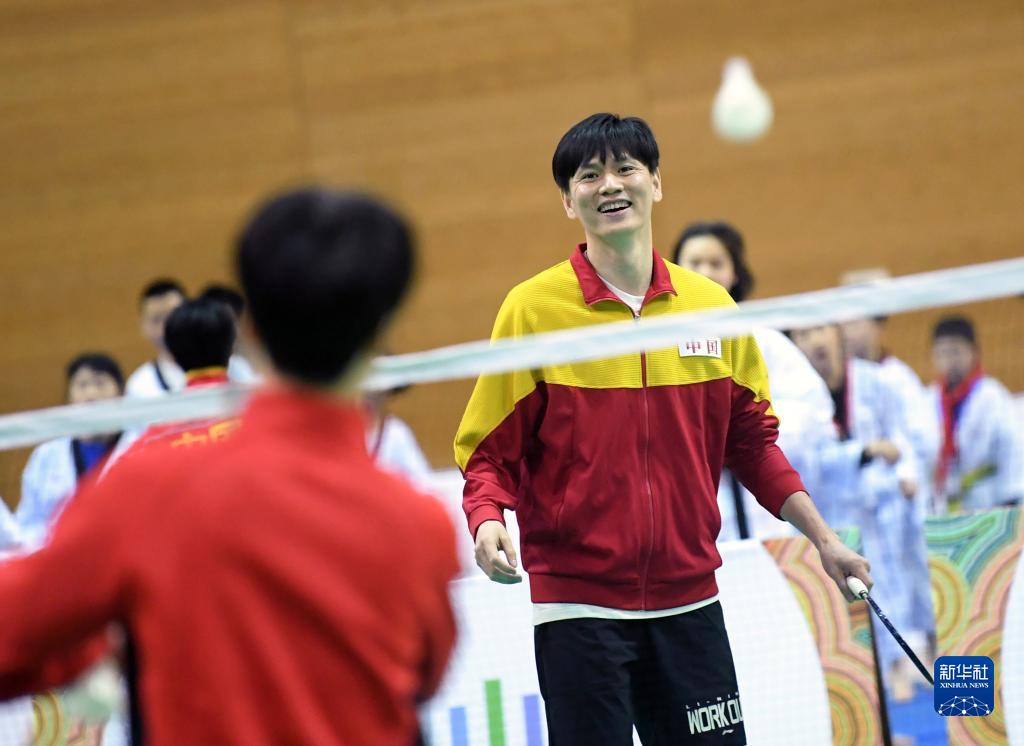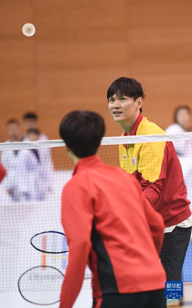 3月29日,羽毛球世界冠军鲍春来(右)在活动中与青少年切磋技艺。新华社记者 翁忻旸 摄