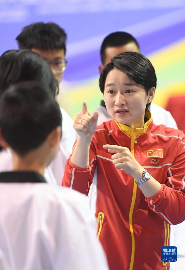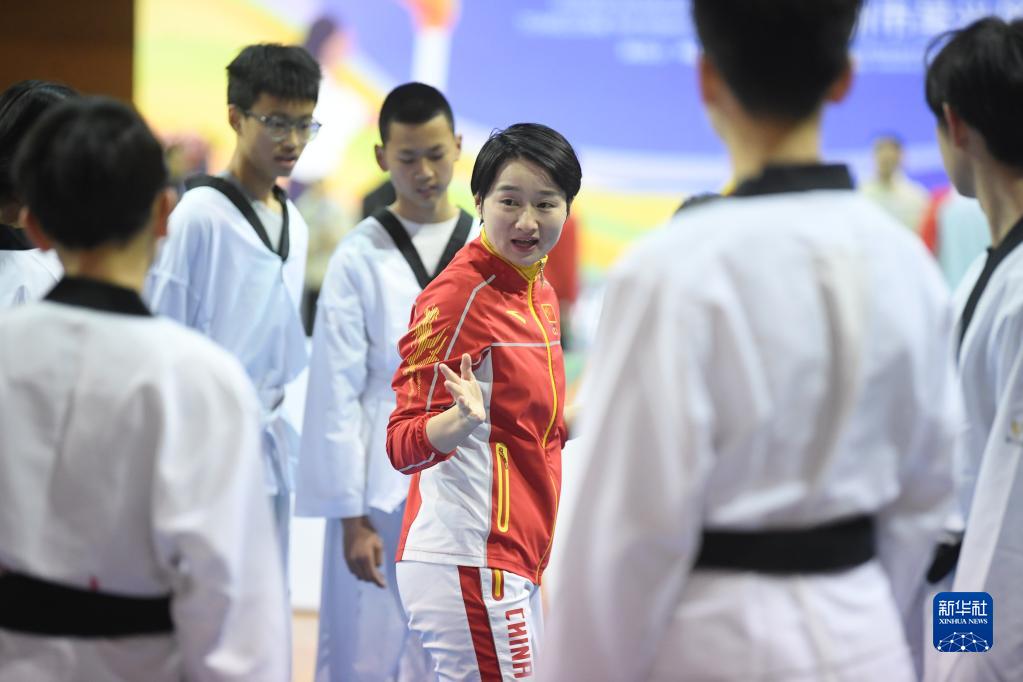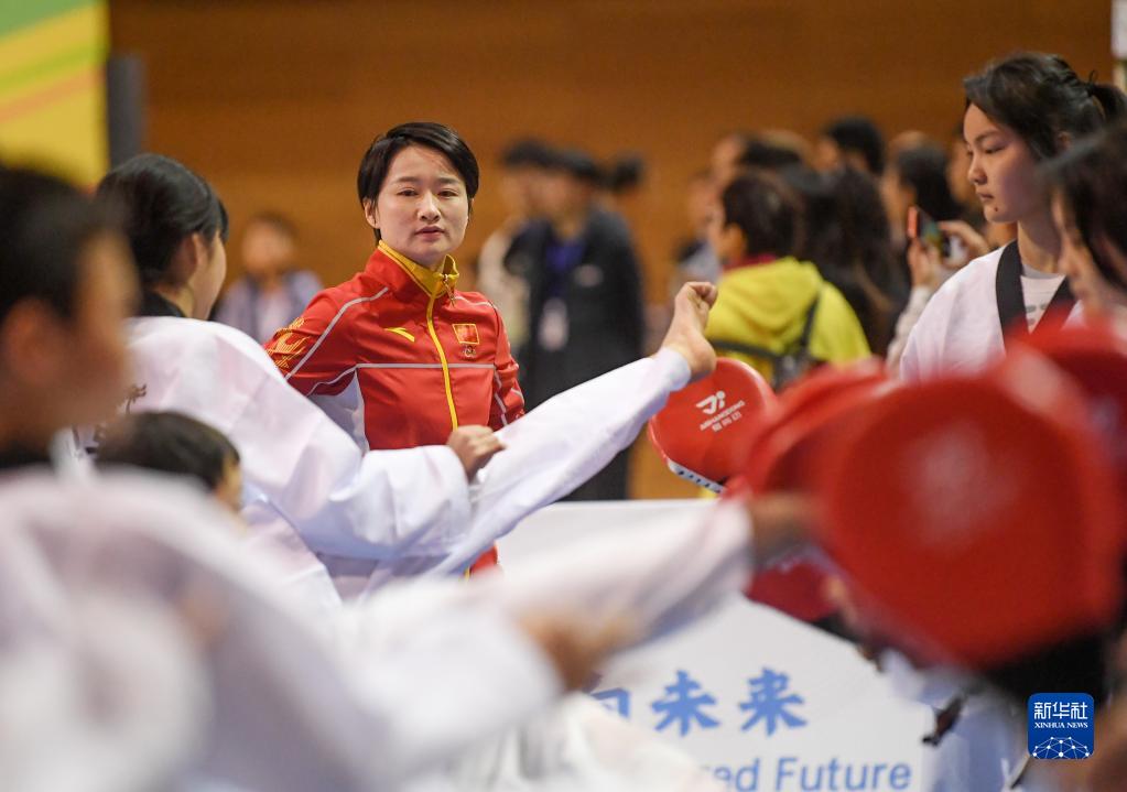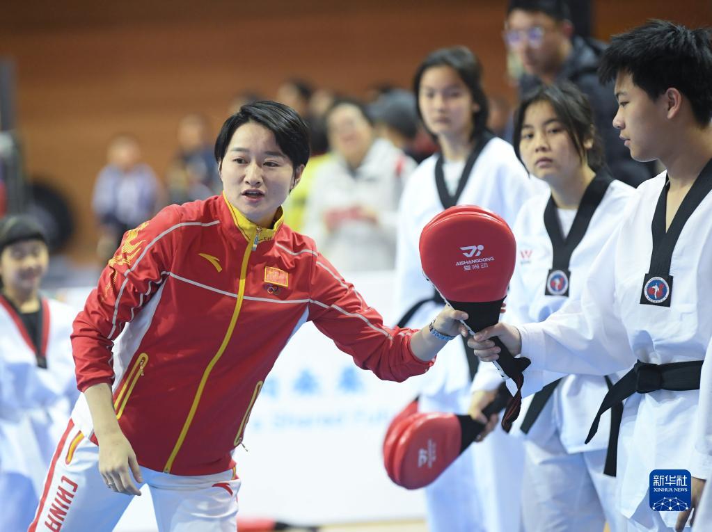 3月29日,跆拳道奥运冠军吴静钰(左一)在活动中指导爱好者进行训练。新华社记者 翁忻旸 摄