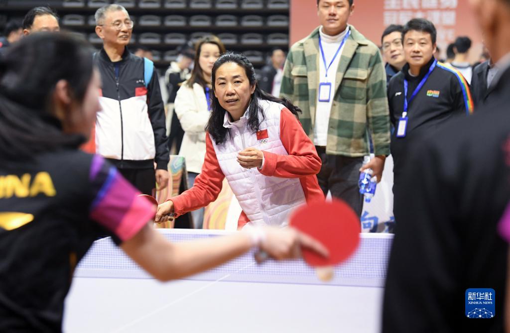 3月29日,乒乓球奥运冠军乔红(中)在活动中与爱好者切磋技艺。新华社记者 翁忻旸 摄