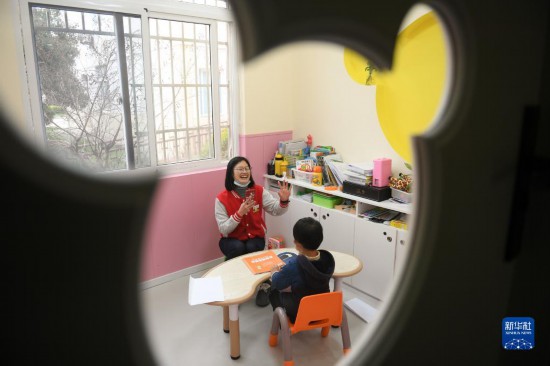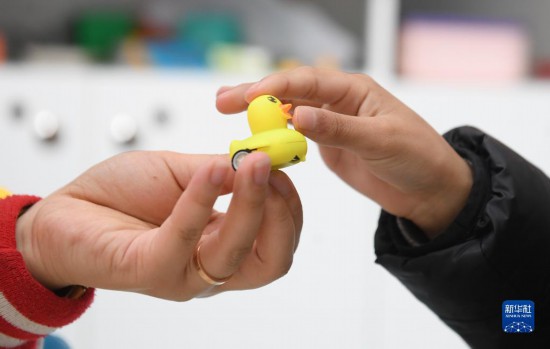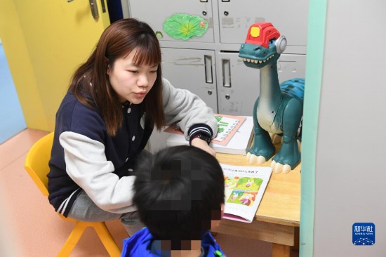 3月29日,一名老师在给自闭症儿童做一对一训练。