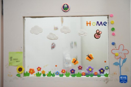这是自闭症青少年和老师一起装扮的教室门(3月29日摄)。