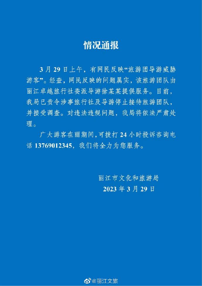 中新网3月30日电 据云南丽江市文化和旅游局官方微博消息,丽江市文化和旅游局29日发布通报,3月29日上午,有网民反映“旅游团导游威胁游客”。经查,网民反映的问题属实,该旅游团队由丽江卓越旅行社委派导游徐某某提供服务。