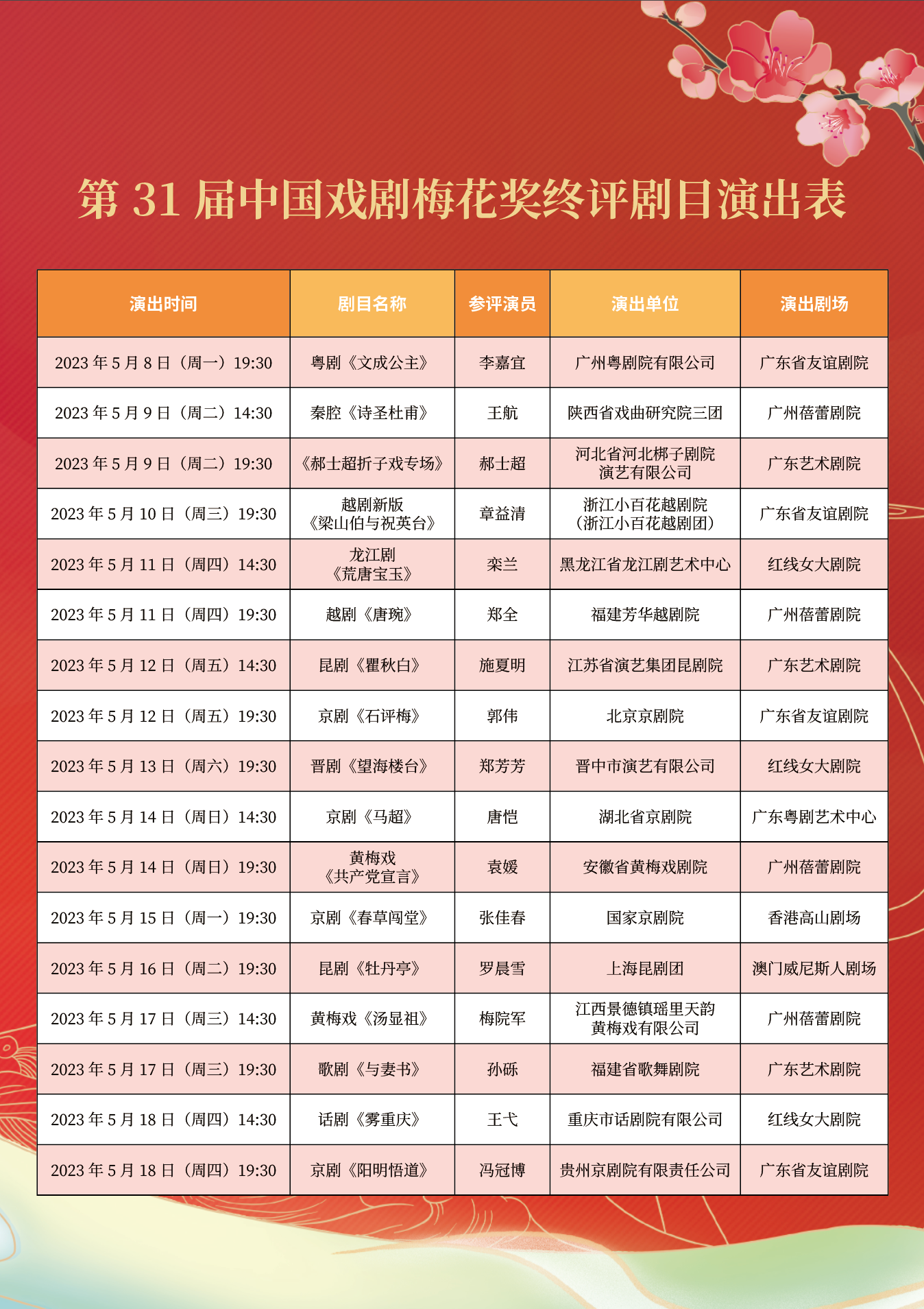 本届中国戏剧梅花奖共有17名演员进入终评,涵盖9个戏曲剧种和话剧、歌剧等戏剧艺术门类,5月8日起,将以现场演出的形式在广州、香港和澳门参加终评,经终评评委现场观摩,差额评出15名获奖演员,于5月21日晚与第25届曹禺戏剧文学奖的5部获奖剧作一同揭晓。5月22日,组委会还将举办本届中国戏剧梅花奖获奖演员座谈会和下基层慰问演出等活动。