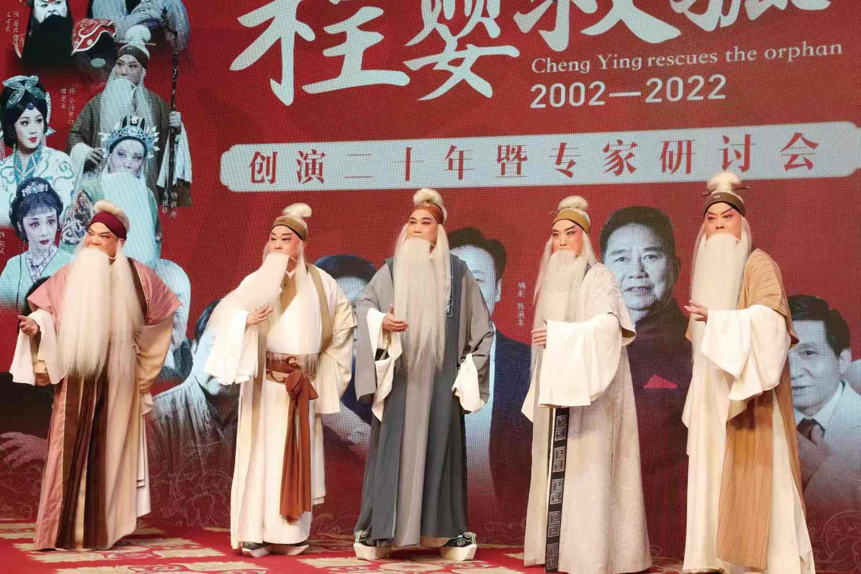 ▲《程婴救孤》创演20年暨专家研讨会现场,秦腔、豫剧、蒲剧、粤剧、婺剧5个剧种中的人物主角程婴集中亮相。主办方供图