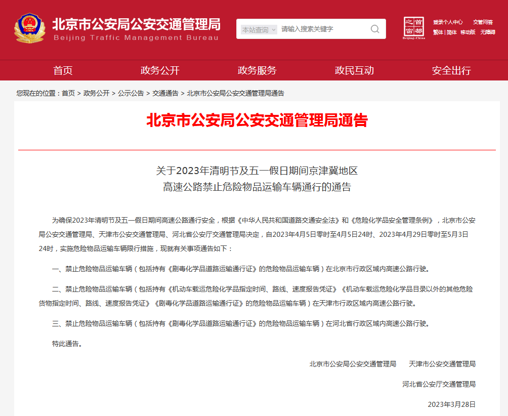 央视网消息:据北京市公安局公安交通管理局网站消息,北京市公安局公安交通管理局、天津市公安交通管理局、河北省公安厅交通管理局通告,自2023年4月5日零时至4月5日24时、2023年4月29日零时至5月3日24时,实施危险物品运输车辆限行措施。