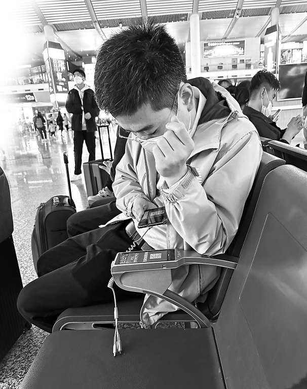 图:高铁站候车的乘客正在扫座椅扶手上的二维码。