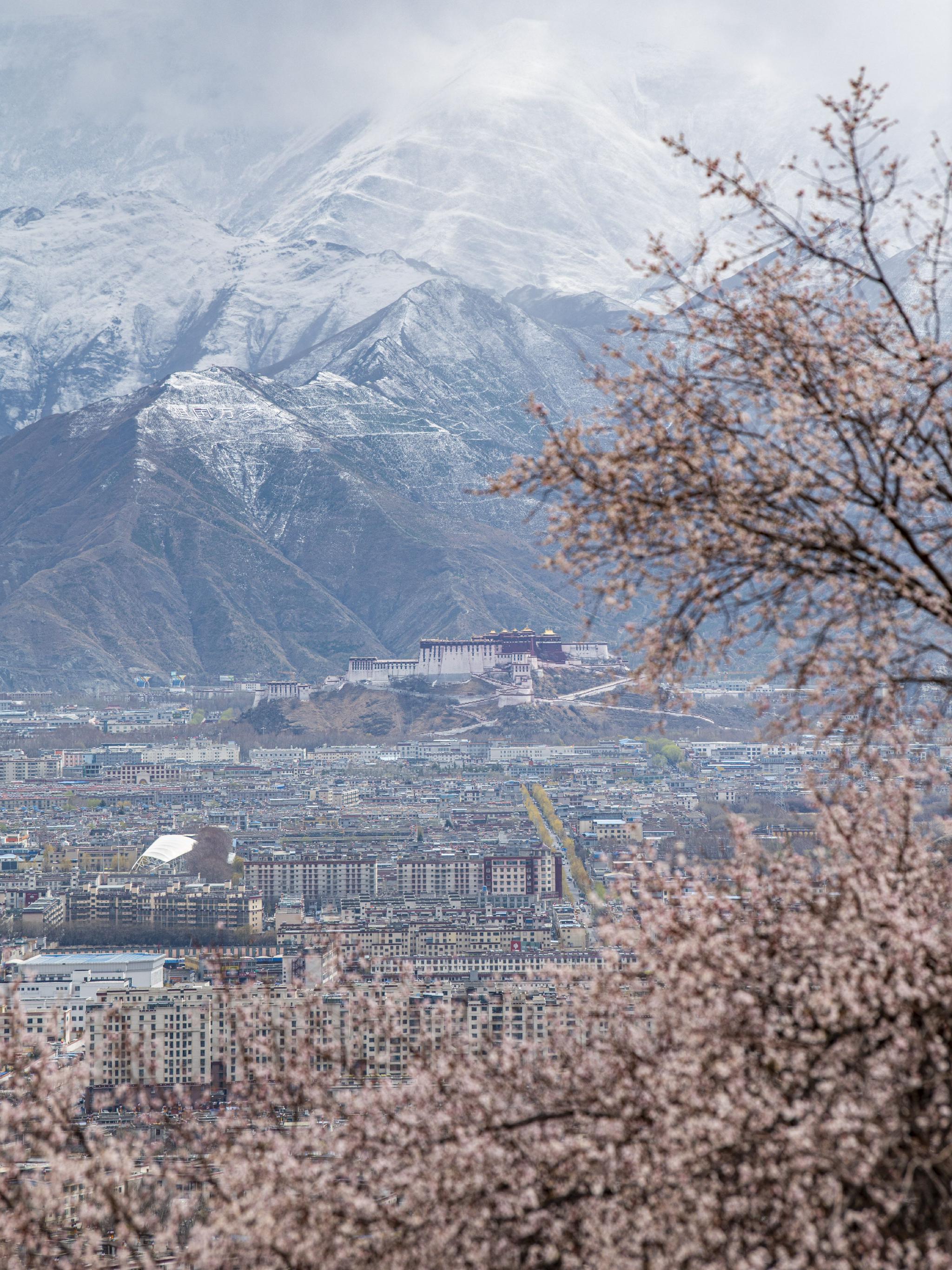 帕邦喀周围盛开的桃花和远处的布达拉宫(3月30日摄)。