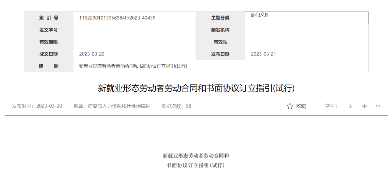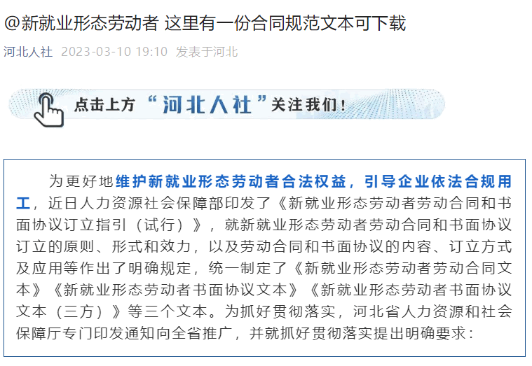 目前,河北、广东海丰、甘肃临夏、安徽阜阳、江西九江等地有关部门均对文件进行公开,并开放劳动合同参考文本的下载。