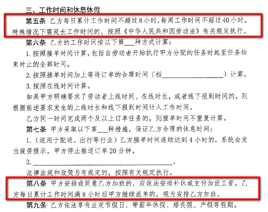 《新就业形态劳动者劳动合同参考文本》第五条规定,乙方每日累计工作时间不超过8小时,每周工作时间不超过40小时。第八条规定,甲方安排或同意乙方加班的,应依法安排补休或支付加班工资。乙方每日累计工作时间满8小时后甲方继续派单的,视为安排乙方加班。