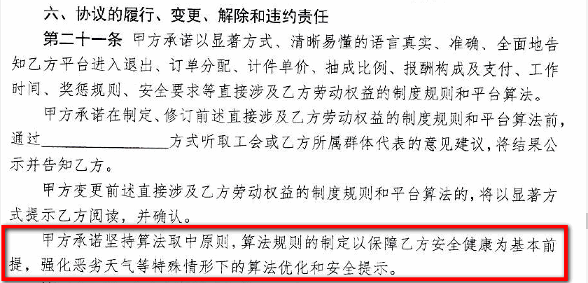 《新就业形态劳动者书面协议参考文本》第二十一条则规定,甲方承诺坚持算法取中原则,算法规则的制定以保障乙方安全健康为基本前提,强化恶劣天气等特殊情形下的算法优化和安全提示。