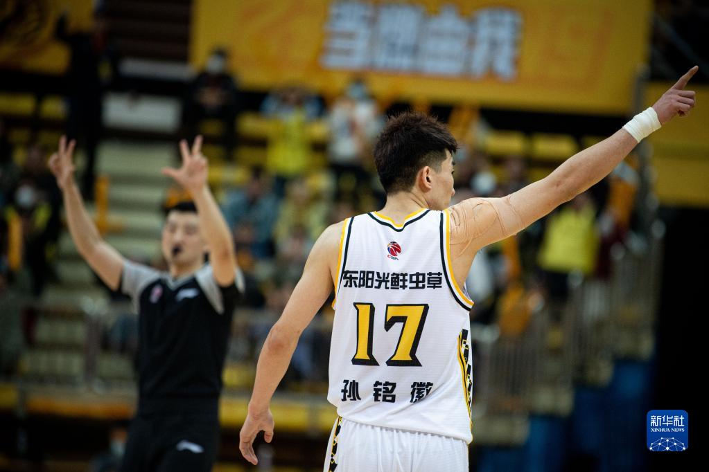 3月30日,浙江东阳光队球员孙铭徽在比赛中庆祝得分。新华社记者 江汉 摄