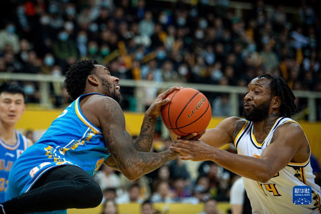 3月30日,福建浔兴股份队球员亚当斯(左)与浙江东阳光队球员威尔斯在比赛中争球。新华社记者 江汉 摄