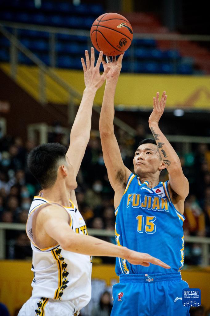 3月30日,福建浔兴股份队球员陈林坚(右)在比赛中投篮。新华社记者 江汉 摄