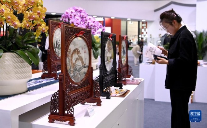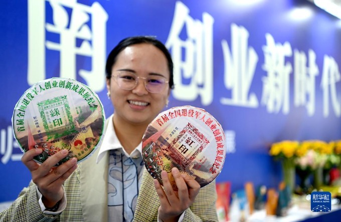 3月30日,首届全国退役军人创业创新成果展交会现场,一名参展人员展示为展会特制的纪念茶饼。