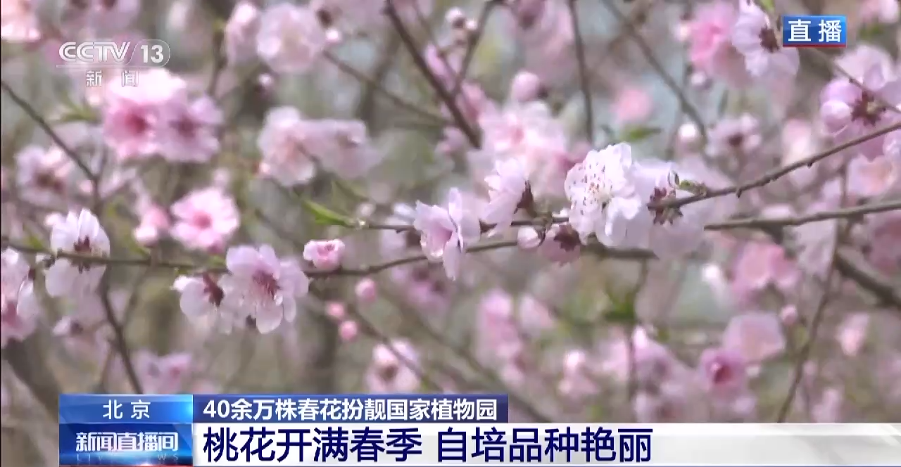 在国家植物园北园,春花盛放,正是最佳观赏期。道路两旁,数十株桃花迎风怒放,形成桃花走廊。国家植物园新培育的桃花品种“品霞”,花朵繁密、色彩鲜艳。因为桃花品种多,所以从每年3月中旬到5月上旬,游客都可以在国家植物园里赏桃花。