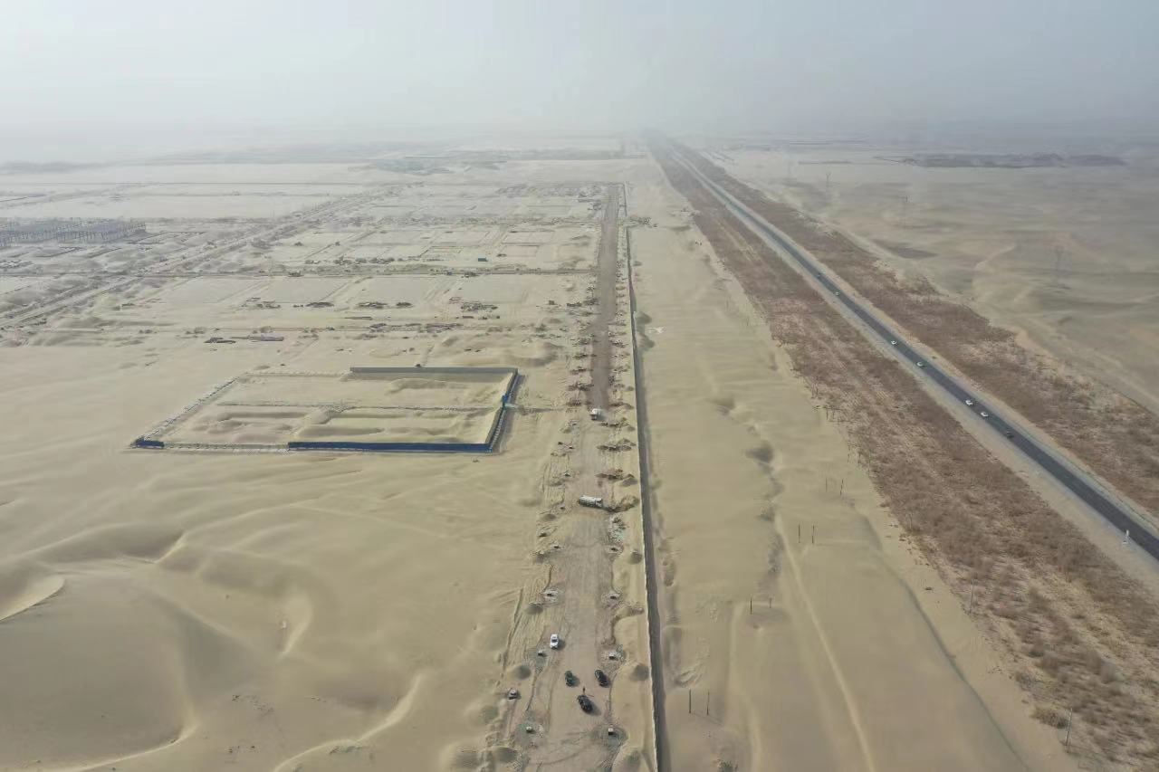 一冶科工承建的和田市建材产业园处于沙漠中心地段,紧临塔克拉玛干大沙漠,一遇刮风天气,天上便尘沙飞舞,扬得头发、嘴巴里满是沙土,对项目施工来说是个不小的难题。项目部人员积极开展图纸学习,不断提高工作效率和质量。在漫天黄沙中,他们每天进行三次以上的人工洒水,保证项目现场及周边位置的卫生,为施工提供了优良的条件。