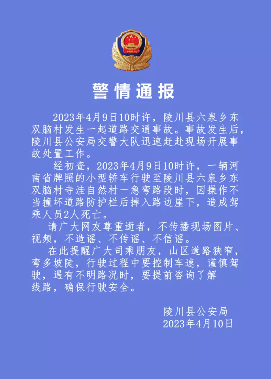根据该通报,4月9日10时许,陵川县六泉乡东双脑村发生一起道路交通事故。事故发生后,陵川县公安局交警大队迅速赶赴现场开展事故处置工作。经初查,2023年4月9日10时许,一辆河南省牌照的小型轿车行驶至陵川县六泉乡东双脑村寺洼自然村一急弯路段时,因操作不当撞坏道路防护栏后掉入路边崖下,造成驾乘人员2人死亡。