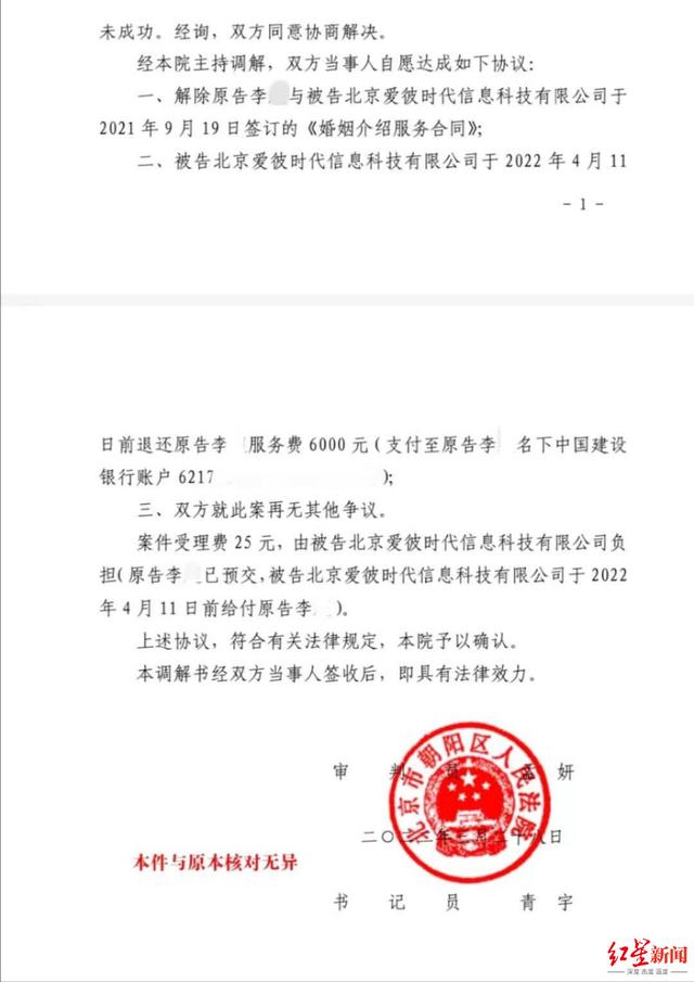 据该法院调解书显示,去年4月,该案进入诉前调解阶段,最终婚介公司退回小李服务费6000元。