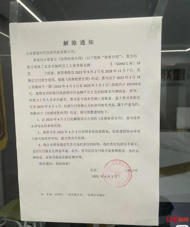↑物业公示显示,北京爱彼时代信息科技有限公司已人去楼空