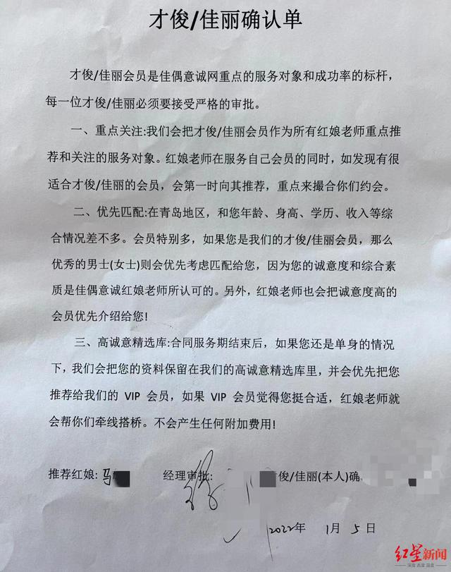 无独有偶,今年1月,2000年出生、从事化学品检验工作的小丁(化名)无意间在社交平台上刷到了婚介服务。不久,同城的一家青岛佳偶意诚婚恋服务有限公司工作人员联系上了她。小丁向红星新闻记者介绍,在经历了封闭场所长时间推销、诱导开通贷款购买项目等与小李相似的环节后,小丁最终通过贷款方式支付了9800元婚介费。与小李不同的是,小丁交钱后心中存疑,当场要求婚介公司退款。“随后该婚介公司的招待员、老板、红娘都来到了会议房间内,对我进行劝说,我最终妥协与该公司签订了合约。”