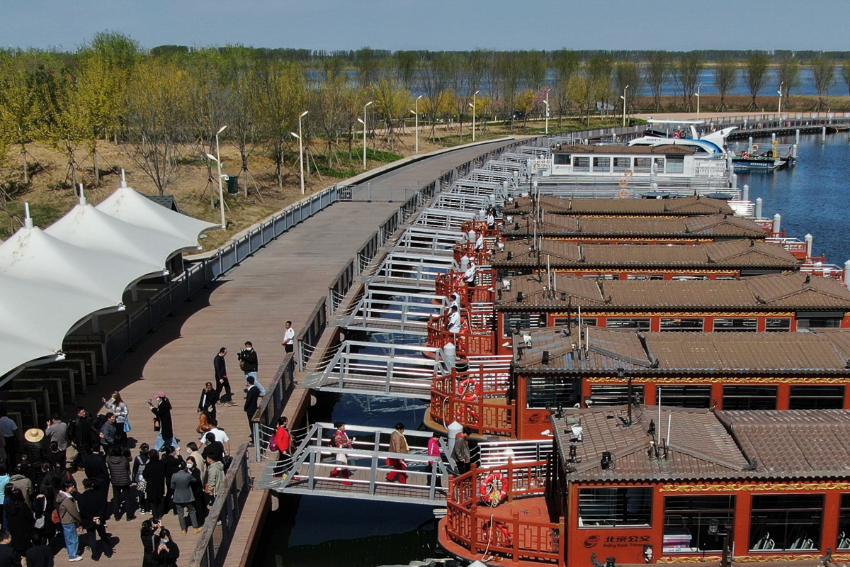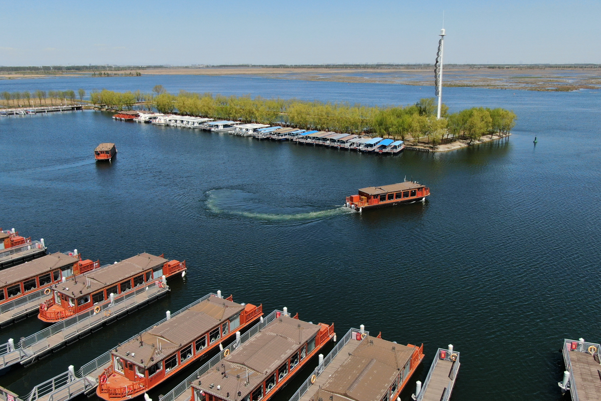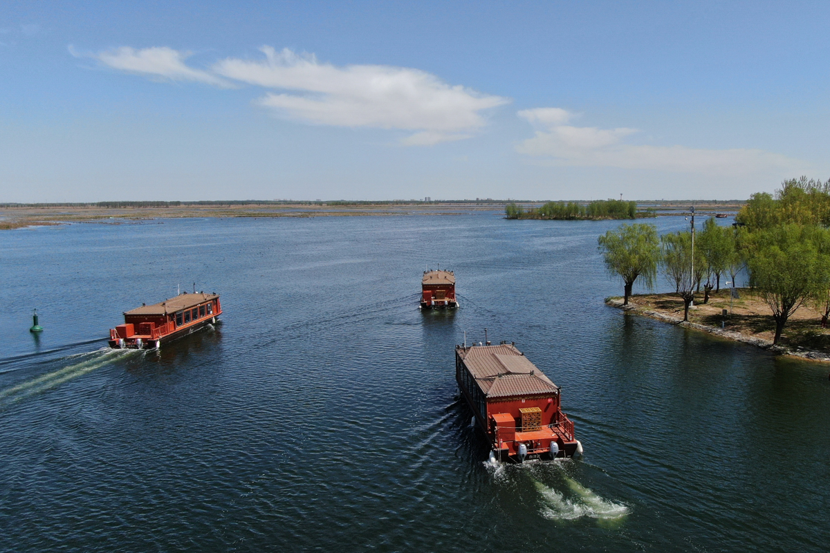 4月7日,处于试运营阶段的白洋淀“水上巴士”项目画舫船在白洋淀内行驶。由北京公交集团运营的白洋淀“水上巴士”项目将于近日正式开通运营。