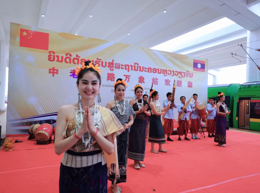 4月13日,在中老铁路老挝万象站,工作人员欢迎乘坐D887次国际旅客列车的旅客。新华社记者 邢广利 摄