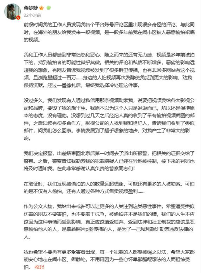“作为公众人物,我站出来或许可以让更多的人关注到这类恶性事件。”蒋梦婕表示,希望遭受类似伤害的朋友不要害怕,也不要羞于抗争,真正应该遭受唾弃、受到法律和社会制裁的应该是恶意偷拍者、p图传播者以及为一己私利敲诈勒索违反法律者。