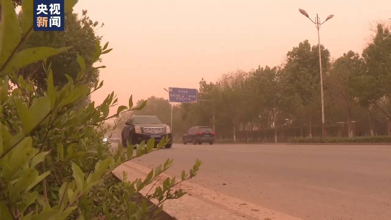 城市上空昏黄一片,能见度很低。伴随大风扬沙,气温也有所下降。