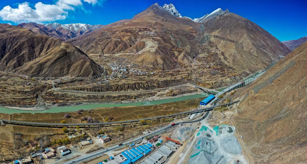 鸟瞰拉萨至日喀则高速公路五曲雅江大桥建设现场(无人机照片,3月12日摄)。新华社记者姜帆 摄