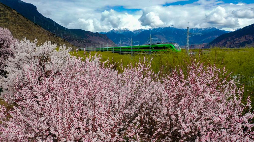 复兴号列车行驶在两侧桃花盛开的拉林铁路上(无人机照片,3月25日摄)。新华社记者姜帆 摄