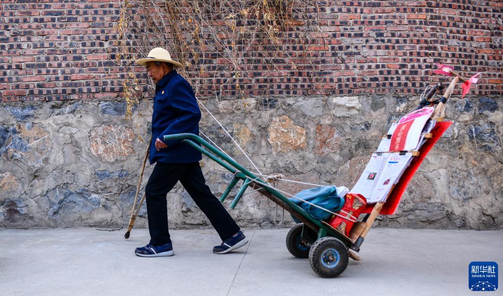 4月19日,李存德拉着车前往农家书屋装书,准备出摊。新华社记者 崔文 摄