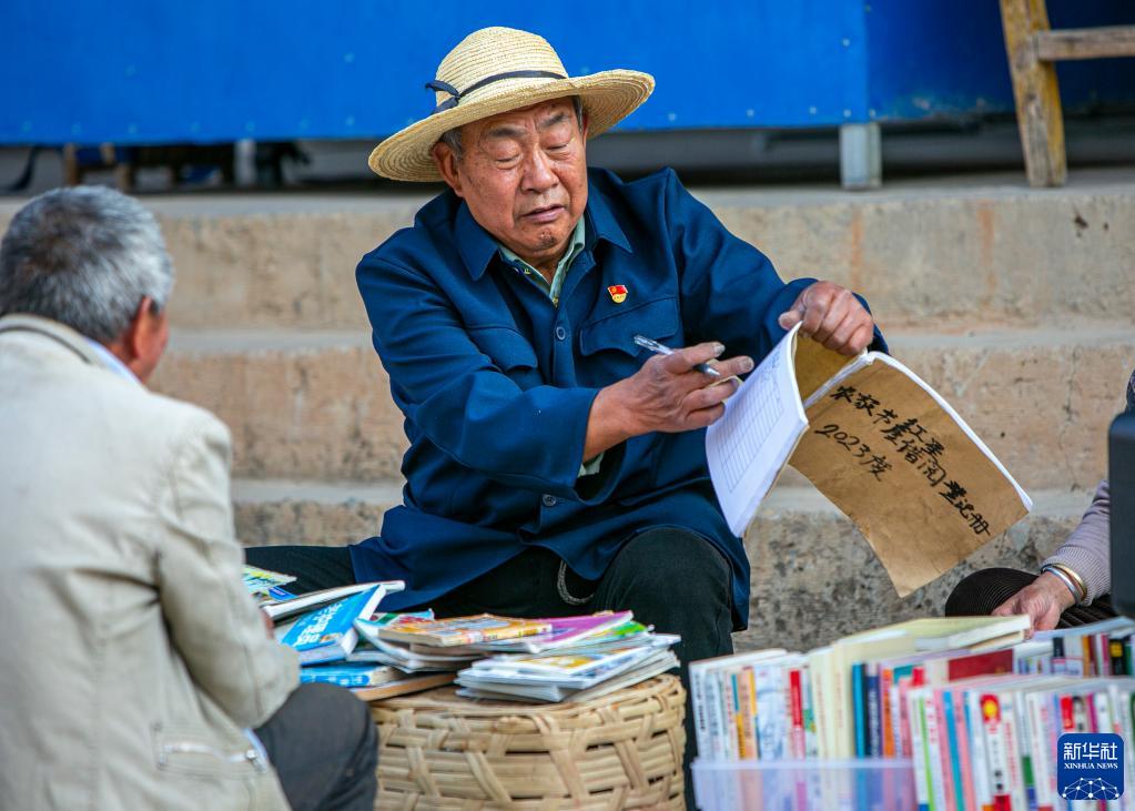 4月19日,李存德在红星村的爱心流动书摊查看借阅登记信息。新华社记者 崔文 摄