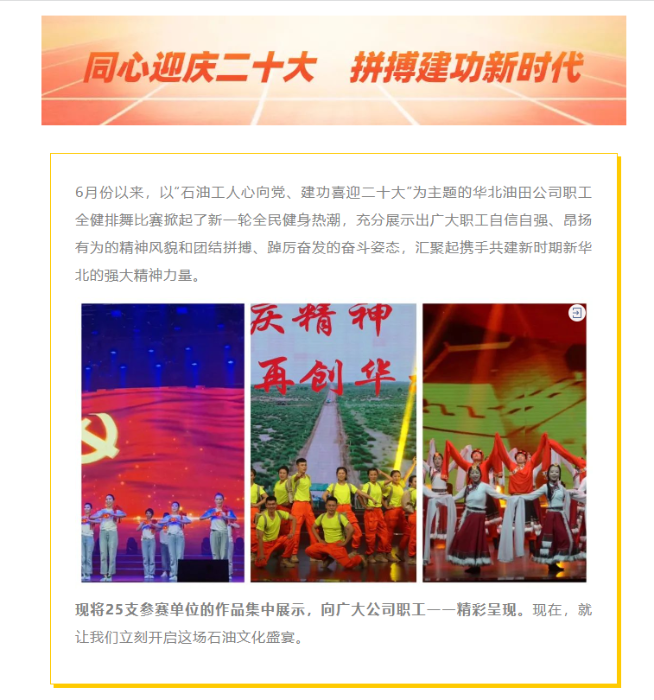 每年一度的华北油田文化体育艺术节连续举办21届,已经成为繁荣油田文化体育事业、服务职工身心健康、促进企业和谐共荣的一项品牌活动。2022年结合疫情防控新形势、新要求,艺术节组委会与时俱进,采取线下组织、线上展播的形式创新打造小型多样化的活动载体,引导广大职工踊跃参与活动,群众性文化体育活动彰显蓬勃生机。6月8日,艺术节开幕式以线上形式“云”启动。6月9日,艺术节“龙头”赛事公司职工全健排舞比赛启动,经过2个月的辛勤排演和组织推进,25家参赛单位的精彩作品在新媒体平台逐一亮相开启群众网络投票环节,点击率达4万余人次,线下大型展演活动让广大职工共享文化盛宴。7月—10月,开展油田公司职工“云”上运动会,依托趣动手机运动平台,将竞技性、趣味性和实效性相结合,最大限度满足职工体育健身需求,进一步推动全员健身运动在广大职工中的普及发展,参赛职工近万人。8月29日,以“弘扬时代主旋律、建功喜迎二十大”为主题的华北油田第三届职工才艺选拔云赛开赛,参赛职工以视频“云唱”“云舞”“云技”等形式参赛,作品形式包括声乐、舞蹈、器乐、曲艺、主持以及原创语言类作品六大类,为职工搭建展示风采的群众大舞台。
