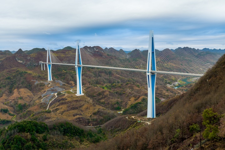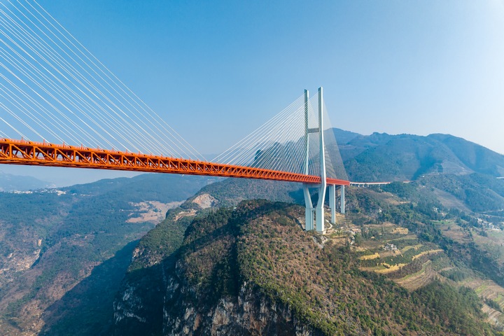 提到大桥,常被人们拿来比较的就是桥高,在贵州的高桥,就不得不提北盘江大桥。大桥位于贵州省六盘水市与云南省宣威市之间,2018年,北盘江大桥经吉尼斯世界纪录认证为“世界最高桥梁”,据精准测算,北盘江大桥的桥面距水面的距离是565.4米,相当于一座188层的高楼。