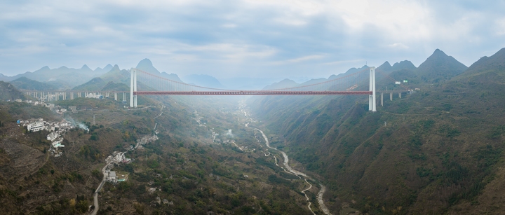 说完高度,再来看看桥的跨度。另外一座获得古斯塔夫斯奖的贵州大桥,是位于贵州省黔西市境内的鸭池河大桥,大桥是世界上山区最大跨径的钢桁(héng)梁斜拉桥,也是世界山区斜拉桥之最。桥梁全长达1450米,空中俯瞰时犹如一条红色的丝带,将两岸连接在一起。