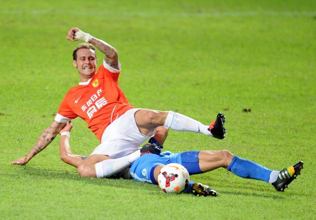 2014年9月28日,当时的广州恒大队球员迪亚曼蒂(左)在比赛中与对手拼抢。新华社记者刘大伟 摄