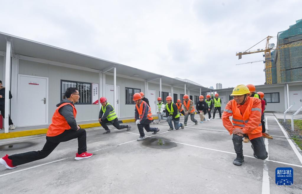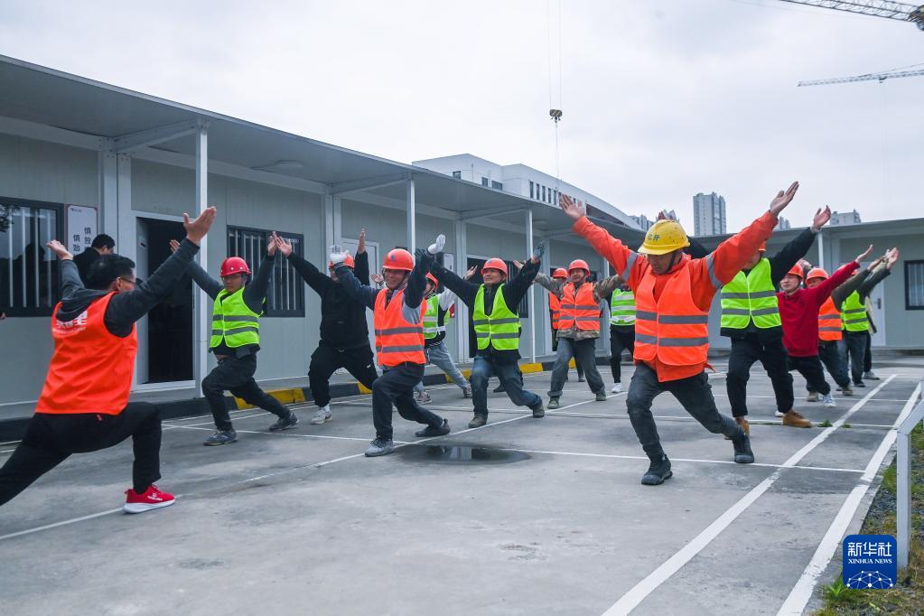 4月25日,社区工作人员带领工地劳动者学习简单的放松操。