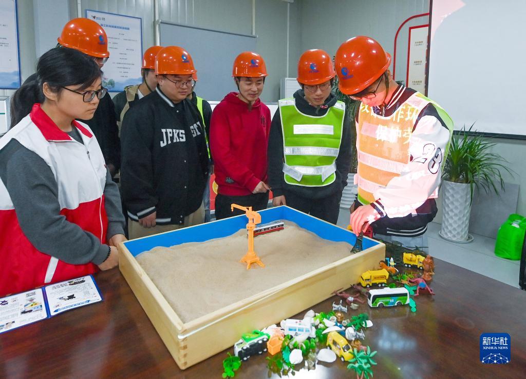 4月25日,龙泉街道心理咨询师(左一)用心理沙盘游戏引导工地劳动者释放压力,促进心理健康。