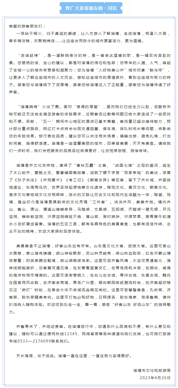 央视网消息:“文旅淄博”微信公号今日发布致广大游客朋友的一封信: