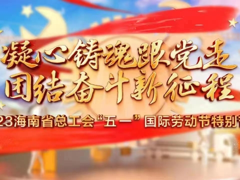直播回顾丨“凝心铸魂跟党走 团结奋斗新征程”——海南省庆祝“五一”国际劳动节特别节目(一) 在2023十四五关键之年的“五一”国际劳动节里,为向获得全国和海南省五一劳动奖章的优秀职工致敬,向奋战在海南自贸港建设一线,踔厉奋发、勇毅前行的劳动者们致敬。4月28日,由海南省总工会主办的“凝心铸魂跟党走 团结奋斗新征程”——海南省庆祝“五一”国际劳动节特别节目在海口举办。中工网首页、微博、视频号同步直播!