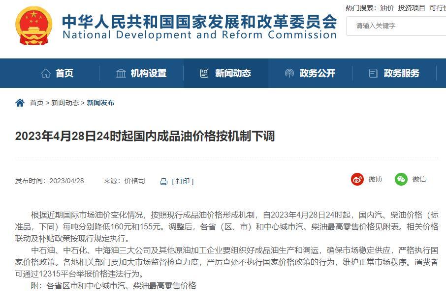 根据近期国际市场油价变化情况,按照现行成品油价格形成机制,自2023年4月28日24时起,国内汽、柴油价格(标准品,下同)每吨分别降低160元和155元。调整后,各省(区、市)和中心城市汽、柴油最高零售价格见附表。相关价格联动及补贴政策按现行规定执行。