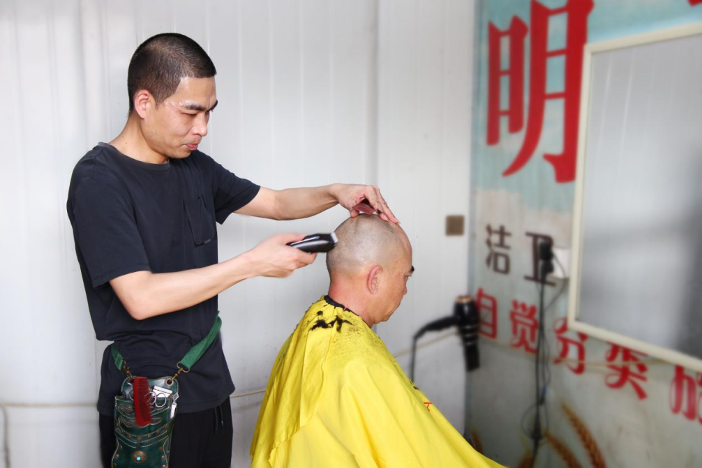 一张凳子、一套工具,一个简易的工地“理发厅”就地开张。项目志愿者耐心引导工友们有序排队,理发师热情、细心询问大家的发型偏好,给每位工友带来私人定制式的服务。工友们一边理发一边聊家常,和志愿者们讲述着工地生活的点滴,现场洋溢着温馨的氛围。