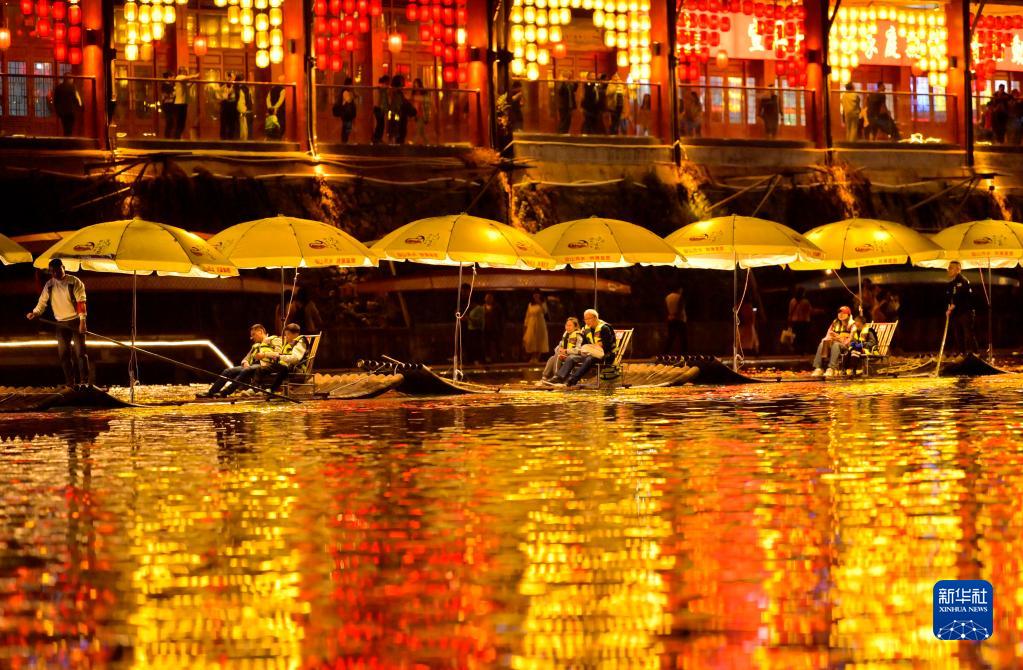4月30日晚,游客在湖北省宣恩县城贡水河上体验“贡水游龙”。