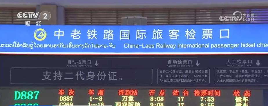 记者 范紫霄:现在是中午12时30分,这趟列车已经到达了磨憨站,也是这趟列车在我国境内的最后一站。跨境前往老挝的旅客需要携带全部行李下车办理通关等一些相关手续,然后继续返回这列我们乘坐的D887次列车,通过画面中的友谊隧道,跨越国境,在今天傍晚6时38分抵达老挝首都万象。