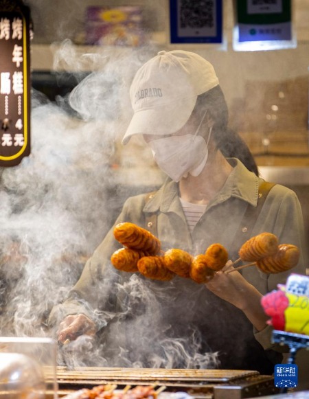 5月2日,商户在宁夏银川市金凤区阅彩城中街制作特色美食。
